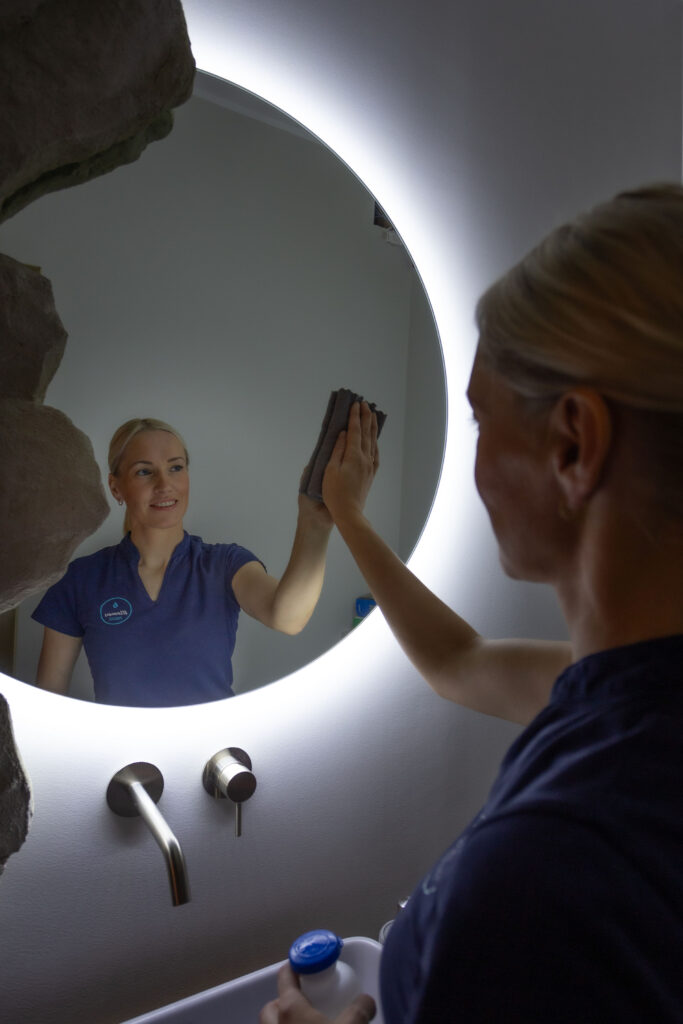 Töö algab raamivahede puhastamisest pintsliga ja tolmuimejaga. Seejärel puhastatakse raamid, kantakse lahus klaasile, töödeldakse pind ning kuivatatakse kummiga pikkade ühtlaste liigutustega. Vajadusel poleeritakse viimane niiskus kuiva mikrokiudlapiga. „Triibuvaba akna saladus peitub õiges lahuses ja tehnikas,“ võtab Ragne kokku.